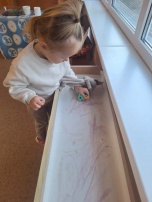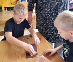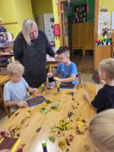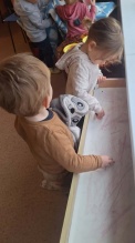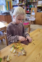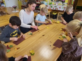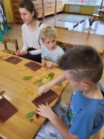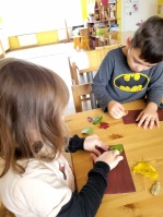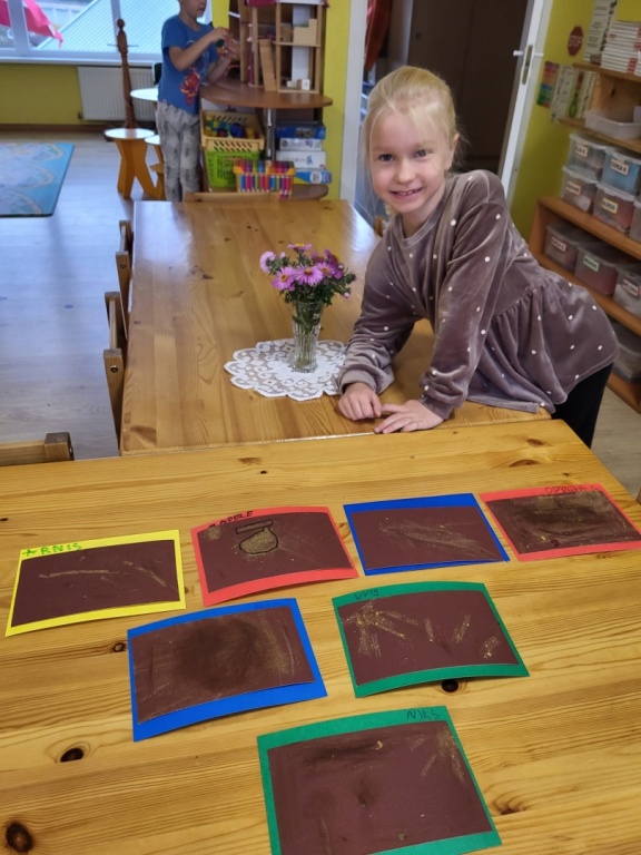 6gadnieki šo jautājumu risināt izlēma palīgā ņemot smilšpapīru un koku lapas. Jautājumam- vai var zīmēt ar koku lapām? Jā, var-vajag pacietību un daudz dažādu krāsu koku lapas. Bērnu prieks un pārsteigums, ka arī tā var zīmēt, liecināja par uzdevuma veiksmīgu rezultātu. Dzeltenās lapas smilšpapīra gleznās iederas vislabāk- tā secināja bērni.