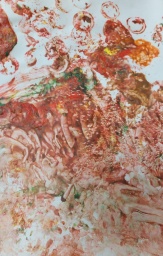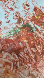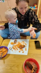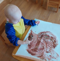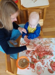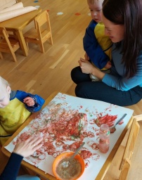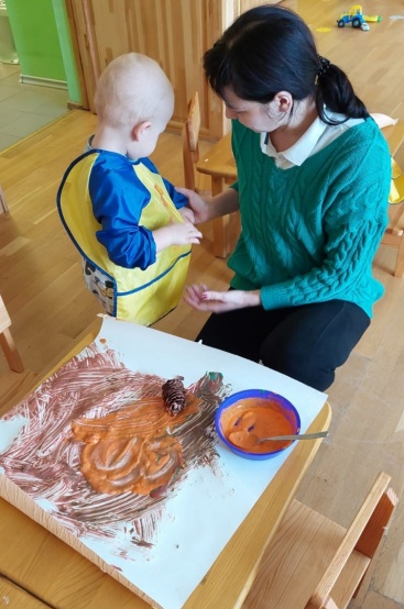 Lai atklātu- ko var paveikt mazi pirkstiņi, plaukstas un čiekuru spurainie sāni, ja talkā nāk pirkstiņkrāsa no miltiem un guaša- bērni azartiski darbojās radošos pēcpusdienas darbos.