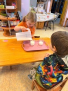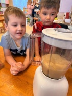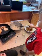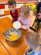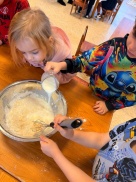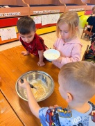 Bērni ar lielu prieku skaitīja un svēra, salīdzināja daudzumus, vēroja, kā mīkla pārtop pankūkās, un mācījās sadarboties.