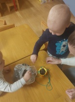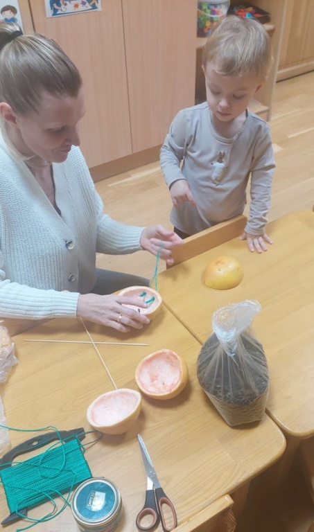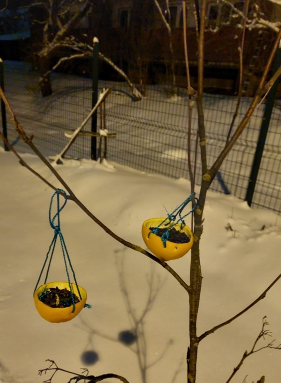 "Zaķīšu" grupas radošā darbošanās kopā ar vecākiem -no apelsīnu, greipfrūtu mizu pusītēm tapa par putnu barotavām. Bērni ar karotītes bēra apelsīnu ligzdiņās saules puķu sēkliņas. Barotavas ligzdiņas izkārām kastaņas zaros, lai priecētu mazos un lielos Rūķīša bērnus un vecākus .priekā sirds gavilēja redzot, ka mielojas zīlītes.