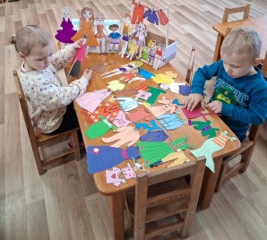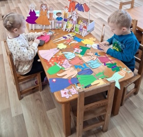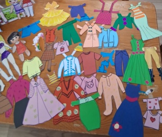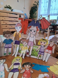 Pēc grupas skolotāju un bērnu lūguma, tika zīmētas un izgatavotas papīra lelles. Izmanto: mācību jomu centros ,ikdienas rotaļās. Apgūst apģērbu nosaukumus. Mācās apģērbt lelli atbilstoši laika apstākļiem.