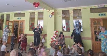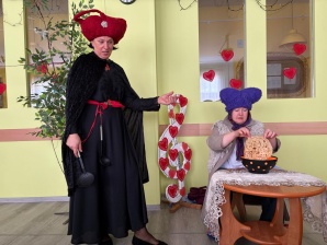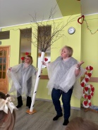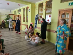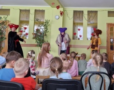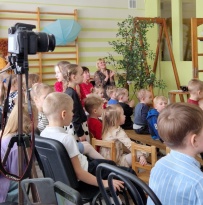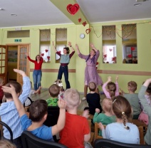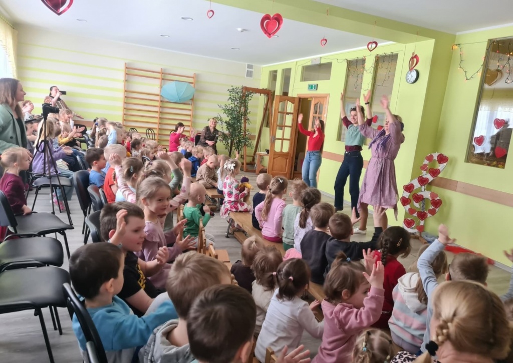 Skanēja mūzika, kas priecēja ar atšķirīgām melodijām, rosinot kustībai, emocijām. Tika izkustinātas kājas- gan lielas, gan mazas. Prātus vingrinot, ciemojās pa kādai burvei un fejai- ļaujot līdzi just un par taisnību iestāties.